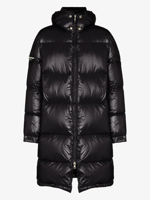 This black White:Space Scott padded coat is crafted from recycled materials with a feather down insulation. It features a quilted finish, detachable toggled drawstring hood, a funnel neck, two-way zip front fastening, long sleeves, zipped side pockets, signature logo branding to the upper right arm and a longline hem.