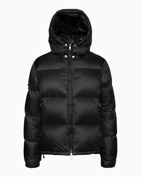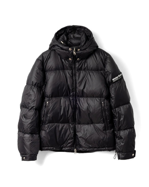 it features a high neck with press-stud fastenings and a detachable hood, long sleeves with logo detailing on the upper right arm, buttoned cuffs, front two-way zip fastening, two zipped side pockets, toggles at the hem for an adjustable fit and all-over quilting.