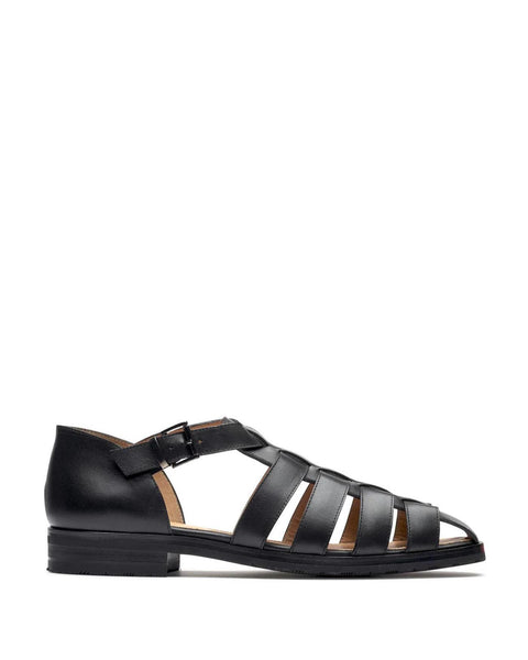 Paraboot Black Leather Ferret Sandals. Upper crafted in pure black leather with tonal leather outsole. Fisherman style, almond toe, ankle strap with buckle fastening, contrasting leather insole.
