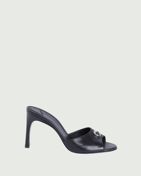 jet black lamb leather silver-tone logo plaque branded leather insole open toe 95mm high heel.