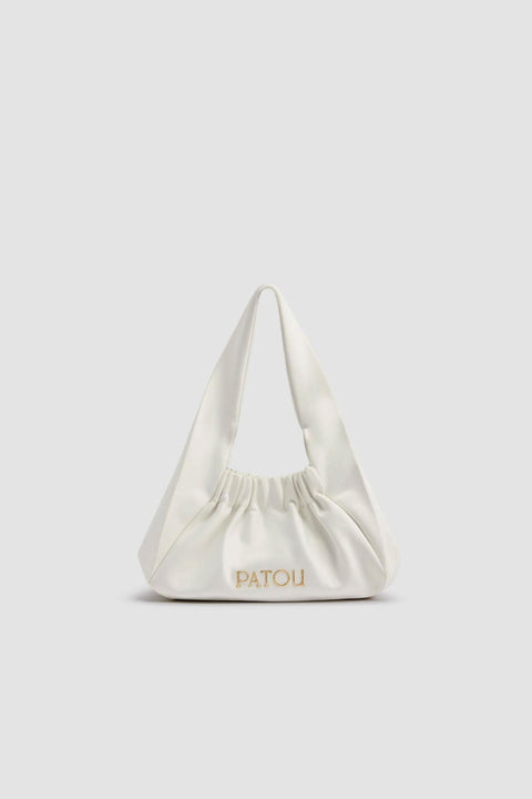 White polyester satin bag. Small version. Hobo shape with wide built-in strap. Elasticated opening. Gold-tone metal Patou.