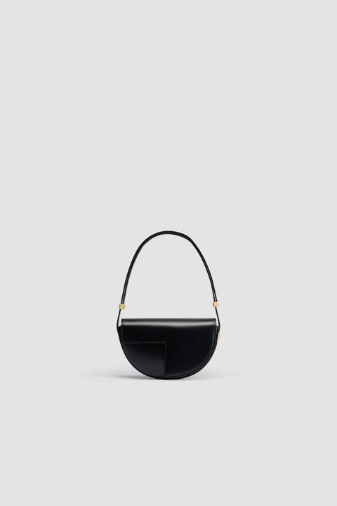 Black leather handbag. Half-circle shape with geometric cut-outs inspired by the JP monogram. Gold-tone hardware with Patou-engraved detail at the side. Adjustable strap that allows it to be worn on the shoulder, across the body or carried by hand. Magnetic closure with gold-tone JP detail. Internal compartment. Eco lining.