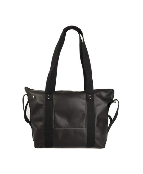 It features cotton webbing straps with rivet detail, including two hand carry straps, a longer, adjustable shoulder strap, a side handle so the bag can be carried vertically, and a wide strap on the back, designed to slide over the handle of your suitcase for practical carrying.