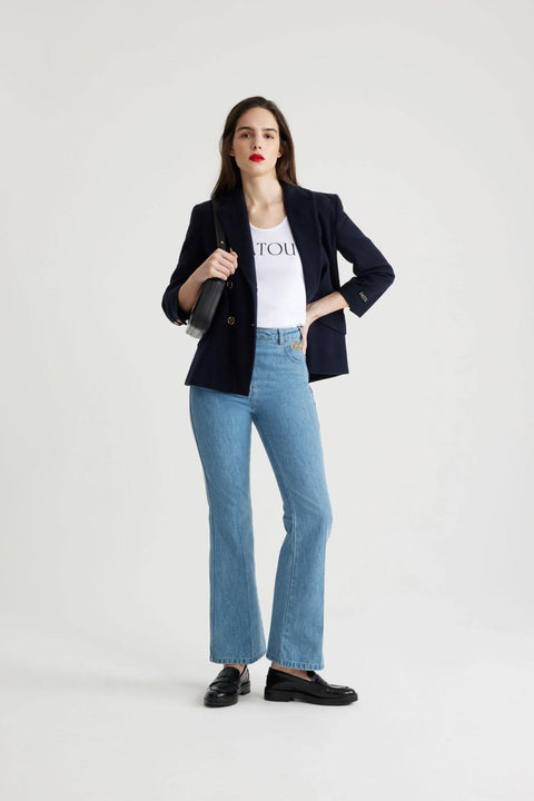Double-breasted virgin wool and cashmere jacket. Engraved gold buttons at the front and on the cuffs. Tailor-style Patou label on the sleeve. Two flap pockets at the front, one internal pocket. Single high vent at the back with button fastening. Fully lined