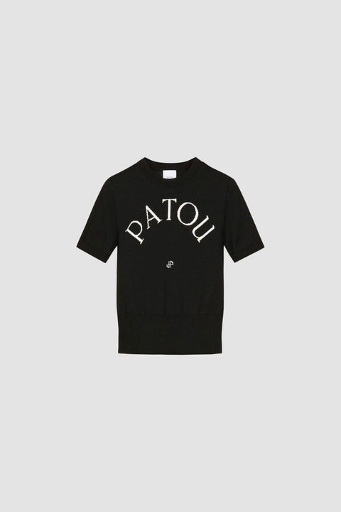 Black organic cotton blend knit top. Fitted style with short sleeves. Round neckline. Ribbed collar, cuffs and waist. Patou lettering logo and monogram jacquard in white at the front.