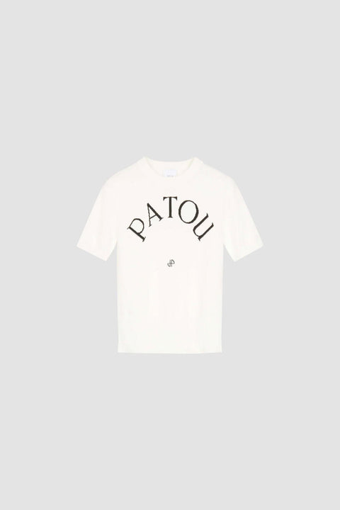 White organic cotton blend knit top. Fitted style with short sleeves. Round neckline. Ribbed collar, cuffs and waist. Patou lettering logo and monogram jacquard in black at the front.