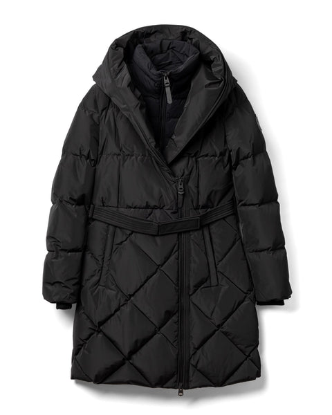 AYUMI is a 2-in-1 long down coat crafted from recycled materials and filled with GRS-certified down. Featuring a removable inner bib in lightweight down, the design offers customizable protection in extreme cold. Diamond quilting at lower body with an adjustable belt, and a dramatic wrap-style collar blend form and function. A hidden toggle at the hood opening, rib knit storm cuffs, and welt zip pockets complete this refined cold-weather essential.