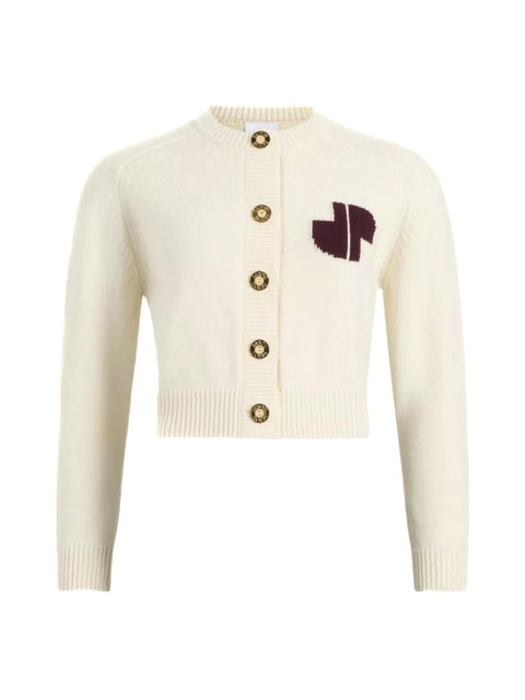 Wool and cashmere cardigan. Round neck. Ribbed collar, cuffs and hem. Button front fastening with gold-tone Patou logo-engraved buttons. Intarsia Art Deco JP monogram at the chest.