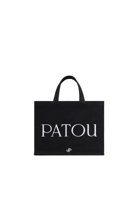 Cotton canvas tote. Medium version. Embroidered Patou logo and JP monogram. Embossed shoulder strap with gold-tone Patou logo-engraved buttons. Two top handles. Can be carried by hand or on the shoulder.