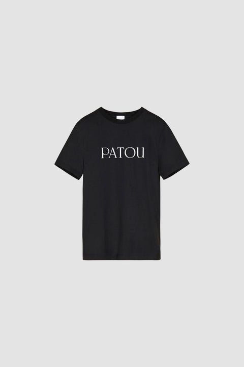 Black organic cotton t-shirt. Crewneck style, regular fit. White Patou lettering logo across the front.