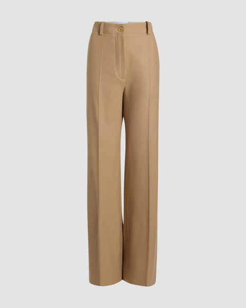 Beige sustainable wool and cashmere blend trousers. Iconic Patou silhouette. Long straight fit. Fastens via a gold-tone JP-engraved button and concealed zip at the front. Belt loops, two pockets at the sides. Signature darts at the back.
