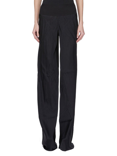 These bias pants are floor-length, loose fitting, and cut on the bias, featuring diagonal seams that trace around the legs. They include square side pockets, an elasticized ribbed waistband, and raw cut hems.